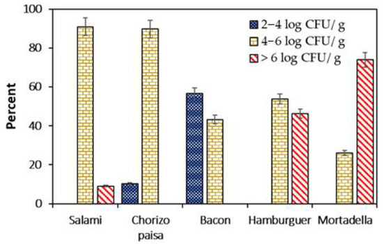 The tolerance levels of L. monocytogenes must be zero according to the policies of the United States government [44]. However, in the present work, for RTE products such as mortadella, more than 25% of the analyzed samples had counts of L. monocytogenes between 4–6 log CFU/g) and 73.90% (>6 log CFU/g). The International Commission on Microbiological Specifications for Food (ICMSF) set a limit of 2 log CFU/g for L. monocytogenes in RTE foods, which is the acceptable limit for low-risk consumers [45], since this pathogenic bacteria is frequently found in processed and RTE foods as well as in fermented meat products [46,47].
