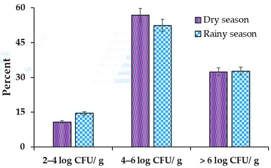 The results reported in this study confirmed the predominance of L. monocytogenes, as well as log CFU/g counts in the meat products, for the two seasons under study (Figure 4). The highest amount of log CFU/g of L. monocytogenes was found in the dry season (56.8%) and the rainy season (52.7%) was found to be between 4 and 6 log CFU/g; this indicates that the meat product samples presented high levels of contamination. The counts of higher than 6 log CFU/g in the two seasons presented almost equal values in the dry season (32.4%) and in the rainy season (32.7%), which indicated that the meat product samples presented levels of deterioration. The counts with levels of 2–4 log CFU/g were the lowest values recorded between the two studied seasons (Figure 4).