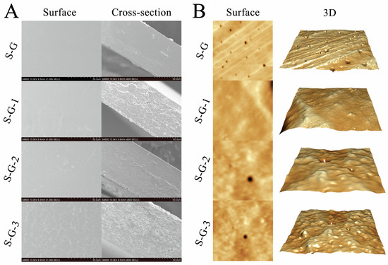 SEM images of the surface and fracture cross-sections of the films with different AO concentrations are shown in Figure 1A. The results show that the surface of the S-G film is continuous and flat, with no obvious bumps or pits, which might be connected to the appearance of ordered phases and a homogeneous protein crosslinked network structure. However, with the increase in the AO concentration, the film surface becomes relatively rough with respect to the S-G film, which might result from the agglomeration and flocculation of the AO dispersed within the film-forming solution during the drying process [22].