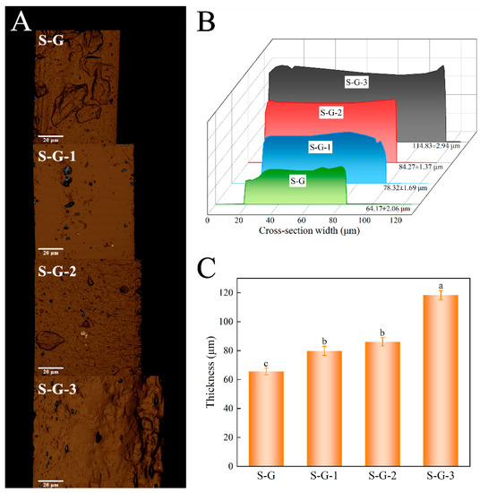 The results from the 3D laser scanning microscope and digital micrometer measurements are depicted in Figure 3. Figure 3A displays the 3D structural conformation of various film cross-sections, while Figure 3B illustrates the cross-section width observed using the 3D laser scanning microscope, directly indicating the thickness variations among the different films. The results indicate that the thicknesses of the S-G, S-G-1, S-G-2, and S-G-3 films are 64.17 ± 2.06 μm, 78.32 ± 1.69 μm, 84.27 ± 1.37 μm, and 114.83 ± 2.94 μm, respectively. These measurements are not significantly different from the values obtained using the micrometer (Figure 3C), and Figure 3C shows that low concentrations of AO have a significant effect on film thickness as early as at the p < 0.05 level, and there is also a significant difference in thickness when AO reaches a high concentration (3%) relative to low concentrations.