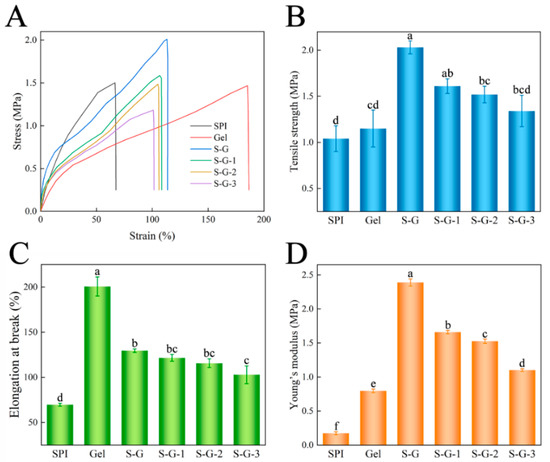 Stress–strain curve (A), tensile strength (B), elongation at break (C), and Young’s modulus (D) of the prepared films. Different letters for the same test parameter indicate significant differences among different groups (p < 0.05).