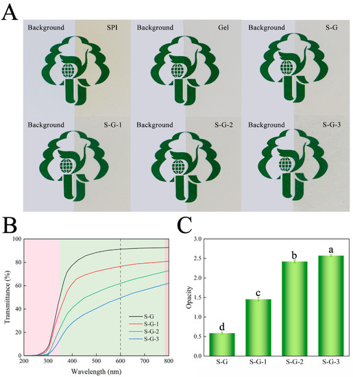 Light transmittance affects the clarity of the film and, therefore, the sensory effect. Figure 5B,C shows the ultraviolet–visible (UV–Vis) transmittance and opacity of each film, respectively. Within the UV wavelength range of 200~350 nm, all the films have good UV-blocking performance, and the UV-blocking ability of the films is gradually enhanced with the addition of AO. In the visible wavelength band (350~780 nm), the light-blocking performance of the AO-added films were obviously superior to those of the S-G films, and the opacity at 600 nm was also significantly higher (p < 0.05), which is consistent with Figure 5A. The droplets formed by AO scatter the light, thus interfering with light transmission [40]. Packaging films that effectively block light could delay the oxidization and deterioration of food.