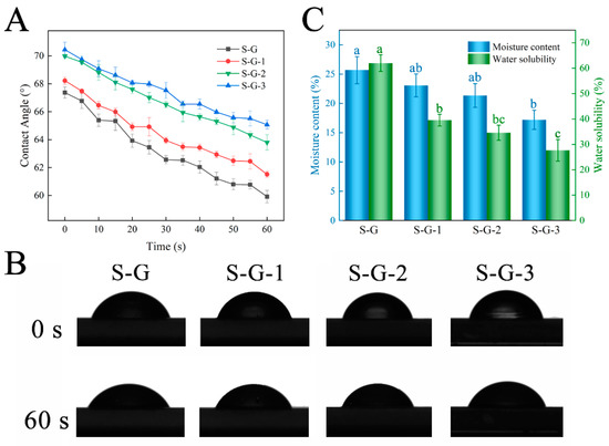 Water contact angle (A), transient photos (B), and moisture content and water solubility (C) of prepared films. Different letters for the same test parameter indicate significant differences among different groups (p < 0.05).