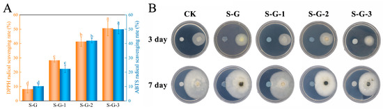As seen in Figure 7A, the higher DPPH radical scavenging rate with increasing AO concentration was mainly attributed to the abundant ketones, alkenes, and sesquiterpenoid components with antioxidant properties contained in AO [49]. The DPPH radical scavenging rate of S-G films was only 8.23%, which increased to 23.08% and, finally, 50.66% after the addition of AO, indicating that AO has good antioxidant potential and significantly enhanced the films’ antioxidant properties (p < 0.05).