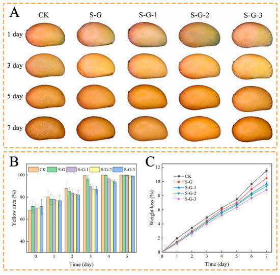 Mangoes of the same size and ripeness were randomly divided into five groups. Before formal experiments, all mangoes were soaked in 2.5% hydrogen peroxide water for 3 min, rinsed, and dried. Then, the mangoes were wrapped using S-G, S-G-1, S-G-2, and S-G-3 films, respectively, and those without film wrapping were set as blank control. Samples were placed in an incubator at 25 ± 1 °C and relative humidity of 55% ± 3%. The indicators of these mangoes were observed and recorded daily. Five replicates were set up for each group.