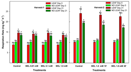 Respiration rates of ‘Fino’ lemons with LEAF and NO LEAF as affected by MEL treatments at 0.01, 0.1 and 1.0 mM (Harvest 1) and MEL at 1.0 mM during 15 and 30 min (Harvest 2) after 21 days of storage. Data are the mean ± SE. Bars with different capital letters denote significant differences between control and MEL treatments, while bars with different small letters denote significant differences between lemons with LEAF and NO LEAF. The asterisk symbol denotes significant differences between both storage days (0 and 21 days) for each type of leaf and treatment.