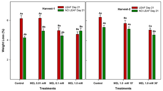 Percentage of weight loss of ‘Fino’ lemons with LEAF and NO LEAF as affected by MEL treatments at 0.01, 0.1 and 1.0 mM (Harvest 1) and MEL at 1.0 mM during 15 and 30 min (Harvest 2) after 21 days of storage. Data are the mean ± SE. Bars with different capital letters denote significant differences between control and MEL treatments, while bars with different small letter denote significant differences between lemons with LEAF and NO LEAF.
