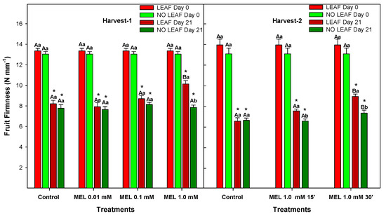 Firmness of ‘Fino’ lemons with LEAF and NO LEAF as affected by MEL treatments at 0.01, 0.1 and 1.0 mM (Harvest 1) and MEL at 1.0 mM during 15 and 30 min (Harvest 2) after 21 days of storage. Data are the mean ± SE. Bars with different capital letters denote significant differences between control and MEL treatments, while bars with different small letters denote significant differences between lemons with LEAF and NO LEAF. The asterisk symbol denotes significant differences between both storage days (0 and 21 days) for each type of leaf and treatment.