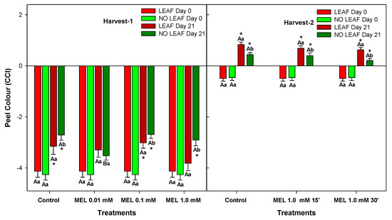 Peel colour of ‘Fino’ lemons with LEAF and NO LEAF as affected by MEL treatments at 0.01, 0.1 and 1.0 mM (Harvest 1) and MEL at 1.0 mM during 15 and 30 min (Harvest 2) after 21 days of storage. Data are the mean ± SE. Bars with different capital letters denote significant differences between control and MEL treatments, while bars with different small letters denote significant differences between lemons with LEAF and NO LEAF. The asterisk symbol denotes significant differences between both storage days (0 and 21 days) for each type of leaf and treatment.