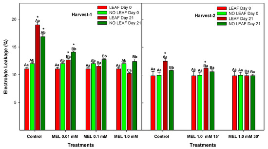 The incidence of CI symptoms results from primary and secondary responses to cold temperatures. Changes in the membrane structures and permeability are primary responses. On the other hand, secondary responses consist of ion leakage, a decrease in cellular energy and oxidative damage [47]. Electrolyte leakage (EL) is among the first defence activation events in plants, and membrane permeability can be evaluated by measuring this parameter. Figure 6 shows that EL significantly increased (p-value < 0.05) from the beginning to the end of storage in both harvests for controls and Mel 0.01 mM. However, those fruits treated with MEL at 0.1 and 1 mM did not show significant differences during storage. LEAF lemons EL showed significant differences (p-value < 0.05) between all MEL-treated fruits and the control, with values of 18.99 ± 0.57% for the control and 10.24 ± 0.26% in lemons treated with 1 mM MEL. Comparing LEAF and NO LEAF lemons, there were significant differences (p-value < 0.05), with an exception for the control after storage at Harvest 1. Nevertheless, there were no significant differences at Harvest 2.