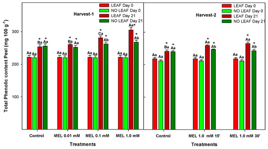 Total phenolic content in peels of ‘Fino’ lemons with LEAF and NO LEAF as affected by MEL treatments at 0.01, 0.1 and 1.0 mM (Harvest 1) and MEL at 1.0 mM during 15 and 30 min (Harvest 2) after 21 days of storage. Data are the mean ± SE. Bars with different capital letters denote significant differences between control and MEL treatments, while bars with different small letters denote significant differences between lemons with LEAF and NO LEAF. The asterisk symbol denotes significant differences between both storage days (0 and 21 days) for each type of leaf and treatment.