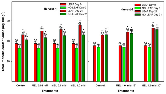 Total phenolic content in juice of ‘Fino’ lemons with LEAF and NO LEAF as affected by MEL treatments at 0.01, 0.1 and 1.0 mM (Harvest 1) and MEL at 1.0 mM during 15 and 30 min (Harvest 2) after 21 days of storage. Data are the mean ± SE. Bars with different capital letters denote significant differences between control and MEL treatments, while bars with different small letters denote significant differences between lemons with LEAF and NO LEAF. The asterisk symbol denotes significant differences between both storage days (0 and 21 days) for each type of leaf and treatment.