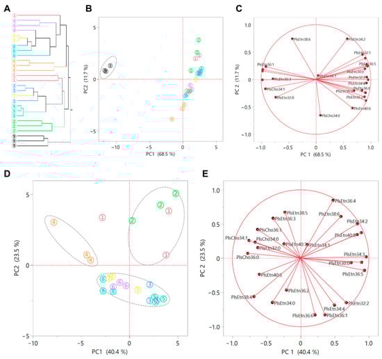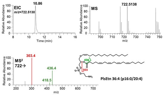 | PlsEtn38:4 | PE P-38:4 | PE P-18:0/20:4 PE P-16:0/22:4 | 11.30 | [M−H]− | 750.5443 | 750.5421 | 2.93 | 303,464,446 331,436,418 |