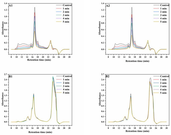 SE−HPLC graphs of wheat protein. ((A1), non-reducing SE−HPLC graphs of protein extracted from wheat treated with superheated steam at 165 °C; (A2), non-reducing SE-HPLC graphs of protein extracted from wheat treated with superheated steam at 190 °C; (B1), reducing SE−HPLC graphs of protein extracted from wheat treated with superheated steam at 165 °C; (B2), reducing SE−HPLC graphs of protein extracted from wheat treated with superheated steam at 190 °C).
