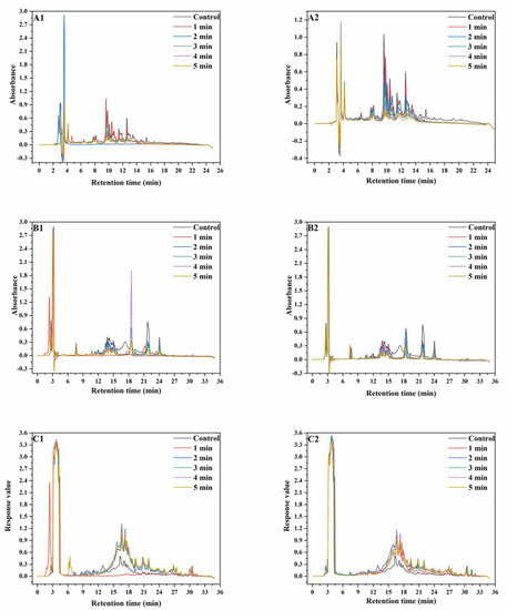 RP−HPLC graphs of wheat protein. ((A), RP−HPLC graphs of wheat albumin and globulin; (B), RP−HPLC graphs of wheat gliadin; (C), RP−HPLC graphs of wheat glutenin; (A1–C1), RP−HPLC graphs extracted from wheat treated at 165 °C; (A2–C2), RP-HPLC graphs extracted from wheat treated at 190 °C).