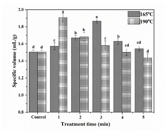 Specific volumes of cakes depend on the amount of air incorporated into cake batter and the gas retention capacity of cake batter, which are dependent on foaming properties of both egg proteins and wheat proteins, and cake batter viscosity [35,36,37]. The specific volumes of cakes made with wheat flour were studied both with and without SS treatment, and the results are shown in Figure 4.