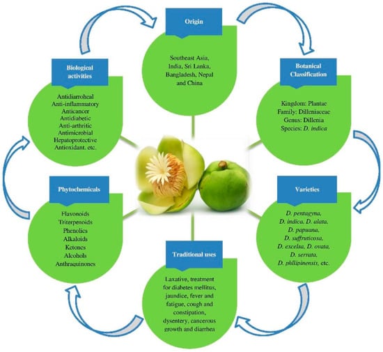 Elephant apple (Dillenia indica L.) is a tree native to Southeast Asia, including India, China, Sri Lanka, Nepal, and Bangladesh (Figure 1). The elephant apple tree is a small- to medium-sized evergreen shrub that can grow up to 15 m tall. In particular, it grows extensively in the moist and evergreen forests of Northeastern India [7,8,9]. It grows in the sub-Himalayan region between Garhwal and Assam, Arunachal Pradesh, Tripura, Manipur, West Bengal, Bihar, and Orissa along with Central and Southern India, and in forests at low and medium altitudes in Nepal, Bangladesh, and Sri Lanka [10,11,12]. It was introduced in 1908 in the Philippines and has now spread across the whole continent [13].