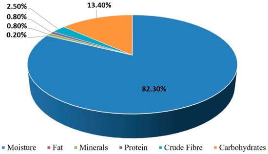 Elephant apple (Dillenia indica) belongs to the family Dilleniaceae. Previous studies have highlighted the presence of primary and secondary metabolites in elephant apple. The primary metabolites, like proteins, minerals, fats, crude fibre, and carbohydrates, that are present in elephant apples are shown in Figure 3 [20]; they are mainly responsible for cell maintenance. Compared to primary metabolites, the chemical structure and properties of secondary metabolites are complex and responsible for plant protection [21]. Using different solvents, the fruits were found to contain flavonoids, phytochemicals, steroids, triterpenoids, and alkaloids, along with tannins [22].