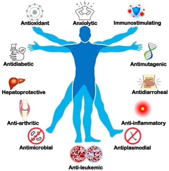 Although many pharmacological investigations have been carried out on elephant apple, still there has been slow progress on the utilisation and exploitation of elephant apple bioactive compounds. These properties of the different parts of elephant apple have been extensively studied for the antidiarrhoeal, anti-inflammatory, anticancer, antidiabetic, anti-arthritic, antimicrobial, antioxidant, analgesic, antimutagenic, antiplasmodial, anthelmintic, anxiolytic, hepatoprotective, and immunostimulating activities (Figure 4). The important biological activities are elaborately discussed in the following Section 3.1, Section 3.2, Section 3.3, Section 3.4, Section 3.5, Section 3.6, Section 3.7, Section 3.8, Section 3.9, Section 3.10, Section 3.11, Section 3.12, Section 3.13, Section 3.14. A summary of the findings of these studies discussed below is presented in Table 5.