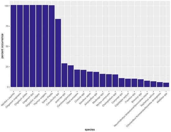 | Camonea spp. | Contaminant | Malva parviflora | Contaminant | Thymus spp. | Contaminant |