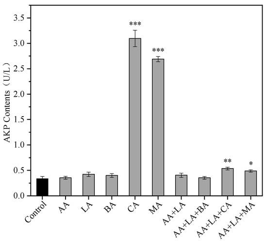 Effect of organic acids and their combinations on the extracellular AKP activity of E. coli. The results are expressed as the mean of three experiments (n = 3); error lines indicate standard deviations; * p ≤ 0.05, ** p ≤ 0.01, and *** p ≤ 0.001 versus the control group using the LSD test. AA, acetic acid. LA, lactic acid. BA, butyric acid. CA, citric acid. MA, malic acid (the same applies to the following).