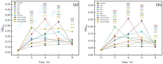 Protein and nucleic acid are macromolecules that exist in bacterial cell membranes and cells. They participate in various functions including DNA replication, transcription, and translation. The release of nucleic acid and protein substances reveals the destruction of the integrity of E. coli cell membranes by organic acids []. Organic acids have the same effect on the leakage of proteins and nucleic acid substances, as shown in Figure 2. According to the highest leakage amount within 0–8 h, the degree of organic acid damage to the E. coli cell membranes was ranked high to low as follows, AA > BA > MA > LA > CA. As can be seen from Figure 2, the LA, BA, and MA groups reached the highest leakage at 2 h, the AA group reached the highest leakage at 4 h, and the CA, AA + LA, AA + LA + BA, AA + LA + CA, and AA + LA + MA groups reached the highest leakage at 6 h. This result may indicate that the combination of organic acids can damage the cell membrane of E. coli for a longer time than the single organic acid.