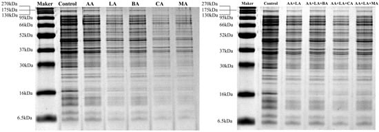 Compared to the control group, E. coli treated with organic acids showed fainter and fewer bands, as seen in Figure 3. As shown in Table 3, 1 MIC of AA, LA, BA, CA, MA, and AA + LA with optimal-inhibitory-concentration-treated E. coli showed similarity coefficients of 93.75%, 93.75%, 87.50%, 84.38%, 78.13%, and 93.75%, respectively. Organic acids and their combinations significantly reduced the intracellular protein content of E. coli, with the relative protein content of both the CA and MA groups being lower than 50%, 43.99% and 45.11%, respectively. The protein profiles of bacteria can be altered during exposure to a stressed environment. According to the analysis results of the gel imaging system (Table S1), 1 MIC BA, CA, and MA resulted in the disappearance of or extremely weak protein bands, mainly concentrated in the protein bands with molecular weights of 148.67 kDa, 42.59 kDa, and 30.00 ~ 33.82 kDa. These results indicated that these organic acids might exert a bacteriostatic effect by destroying certain proteins with specific functions.