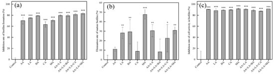 In the process of biofilm formation, EPS produced by microorganisms will limit the diffusion of disinfectants into the biofilm, making the biofilm play a role in protecting pathogenic bacteria from adverse conditions and antibacterial agents []. Biofilms have a complex matrix of EPS that envelopes microorganisms on the surface, making biofilm removal more difficult and requiring the use of intense shear forces (scraping or scrubbing) or the chemical breakdown of the adhesion forces by utilizing antimicrobial substances or heat []. Figure 4b shows that the effects of different organic acids on the mature biofilm are quite different. CA at 1 MIC and AA + LA + BA at the optimal inhibitory concentration have the lowest elimination rate of 8.89% and 8.29% on the mature biofilm, respectively, while MA at 1 MIC has the highest elimination rate of 47.60%. Studies have shown that the combined treatment of ultrasound and organic acids can effectively remove E. coli biofilm formed on lettuce leaves and has a synergistic effect []. Both organic acids and their combinations inhibited the cell activity within the E. coli biofilm by about 90%, as shown in Figure 4c. Therefore, the use of organic acid combinations as disinfectants for E. coli with established biofilms has significant advantages, and the combination with other physical means can also be effective for the removal of mature biofilms.