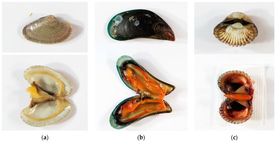 Photographs of whole mollusk and the edible part inside of individual species: (a) clam (Paphia undulata (Born, 1778)); (b) mussel (Perna viridis (Linnaeus, 1758)); (c) cockle (Anadara granosa (Linnaeus, 1758)).