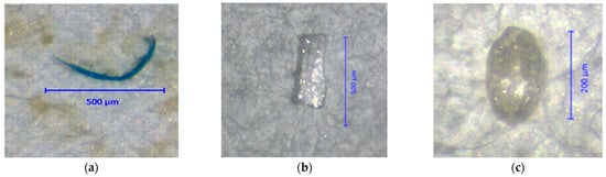 Stereomicroscopic images of MP-like particles detected in bivalve samples: (a) fiber; (b) fragment; (c) pellet. The filter papers were examined under a stereomicroscope at 40× magnification.