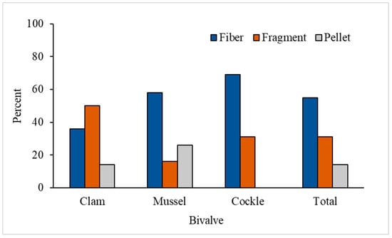 Similar to previous studies, the most abundant type of MP in the bivalve samples of this study was fibers. A previous study reported that all MPs detected in farmed and natural mussels were fibers with lengths of 750–6000 μm []. Another study reported that fibers were the most commonly found MPs in bivalves and consisted of more than half of the total MPs in each of the eight species []. The fact that fibers are the most abundant MPs detected in bivalves could probably be due to the fact that they are the most prevalent type of MPs found in the environment []. In addition, the morphology of these filaments allows them to be easily accumulated in bivalve species.