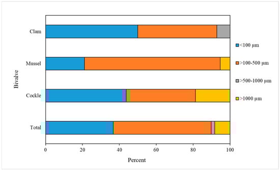 The sizes of MP-like particles detected were approximately in the range 20–1500 µm. Figure 4 shows the size distribution of MP-like particles found in the bivalve samples. The sizes of the MP-like particles found were classified into four groups: ≤100 µm, >100–500 µm, >500–1000 µm and >1000 µm. The most abundant size range of MP-like particles was >100–500 µm; this size range was found for 26 items of all the MP-like particles detected (53.1%), followed by the ≤100 µm size (18/49 items, 36.7%), and the >1000 µm size (4/49 items, 8.2%). The least abundant size range of MP-like particles detected was >500–1000 µm (1/49 items, 2.0%). However, because of the inability to extend fiber items for exact measurements, the sizes of MP-like particles, especially fibers, are approximate values.