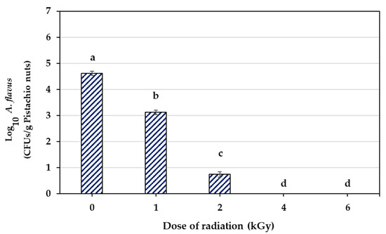 Disinfection of A. flavus using different doses of e-beam radiation on infected pistachios. Data display the means of triplicates. Different letters above bars show significant differences between treatments (p < 0.05, based on Duncan’s test).