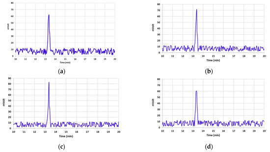 Chromatograms of contaminated pistachio kernels with AFB1 at different doses of e-beam irradiation (0, 1, 2, 4, and 6 kGy (a–e)) according to LC analysis.