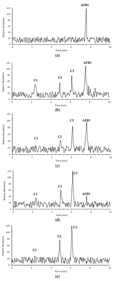 For liquid chromatography–mass spectrometry (LC-MS) analysis, AFB1 was extracted from the samples using an 80% ethanol aqueous solution. AFB1 degradation products were detected by injecting 10 µL of the extract into an Agilent 1200 LC-MS system (Agilent Technologies, Inc., Santa Clara, CA, USA) equipped with an Agilent Eclipse Plus C18 column (100 mm × 3.0 mm with a 1.8 μm particle size) and a 6410 triple-quadrupole mass spectrometer with a flow rate of 0.3 mL/min at 60 °C. The mobile phase contained 0.1% aqueous formic acid (component A) and acetonitrile with 0.1% formic acid (component B). The analysis was performed in both gradient and isocratic elution modes. The procedure began the gradient for 1 min with 10% of B, and then B was escalated to 95% for 20 min and kept isocratic for 7 min. The analysis was performed in triplicates within a total run time of 30 min per sample. The MS was performed in positive-ion mode with the following conditions: a capillary voltage of 3.2 kV; desolvation temperature of 350 °C; nebulizing gas flow of 3 L/min; source block of 110 °C; drying gas flow of 20 L/min; and mass range of 200–400 m/z [25].