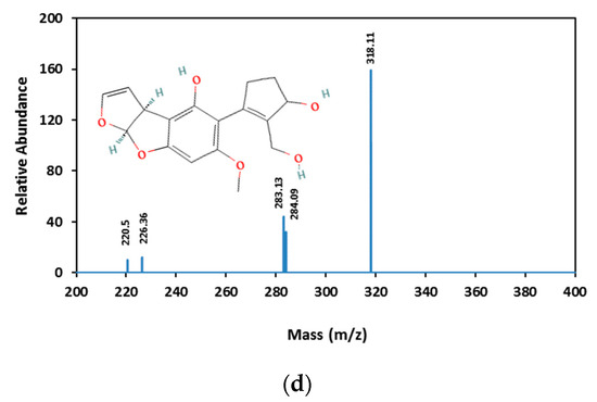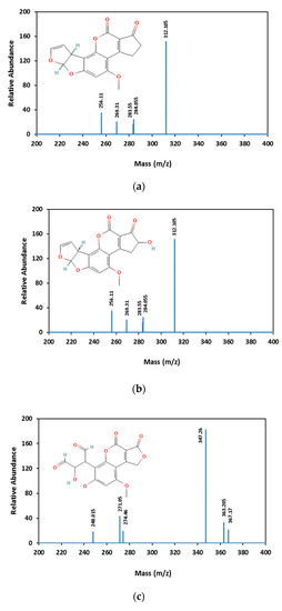 Mass spectrometric analysis of AFB1 and its degradation products. AFB1 (a) and the degradation products of AFB1 (b–d are C1, C2, and C3, respectively) analyzed using MS.