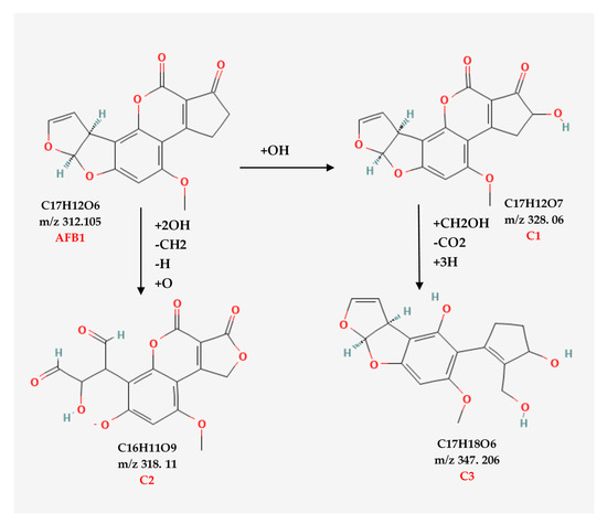 The possible degradation pathway for AFB1 and the molecular formulas of its degradation products are illustrated in Figure 5. According to the proposed pathway, the degradation of AFB1 due to e-beam irradiation started with the hydroxylation of cyclopentenone and the formation of C1 as an intermediate compound. It should be noted that C1 showed a structure similar to that of aflatoxin M4 (AFM4), the hydroxylated metabolite of AFB1 with less toxicity [31]. Further, increasing the radiation dose led to lactone ring cleavage, adding a hydroxymethyl and a hydroxyl group to the cyclopentanone, the hydroxylation of the benzene ring, and the formation of the degradation product C3. On the other hand, the cleavage of the furan ring and the breakage of the C8–C9 double bond, and the addition of two aldehyde groups, following the deprotonation of the benzene ring and phenolate formation, led to the development of C2.