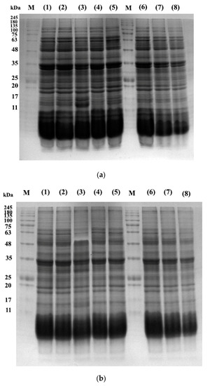 - Laemmli, U.K. Cleavage of structural proteins during the assembly of the head of bacteriophage T4. Nature 1970, 227, 680–685. [Google Scholar] [CrossRef]
