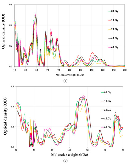 Makari et al. (2021) [6] reported an increase in the intensity of treated pistachio protein bands at a dose of 2 kGy, and a decrease in protein intensity when increasing the γ-radiation dose up to 6 kGy. Alinezhad et al. (2021) [22] reported that γ-rays changed the pattern of pistachio proteins such that the intensity of the bands decreased via γ-irradiation (6 kGy), while the protein bands with a molecular weight of 7 kDa at a dose of 4 kGy were intensified. Naei et al. (2019) [47] observed a reduction in the disappearance intensity of protein bands after the irradiation of pistachio nut extracts with high doses of γ-rays (100 kGy). According to Krishnan et al. (2015) [23], after γ-irradiation of two varieties of soybean, some protein bands disappeared or new bands appeared; they stated that these changes in band intensities can be explained by variations in the physicochemical properties of proteins such as oxidation, leading to the polymerization, condensation, or aggregation of proteins.