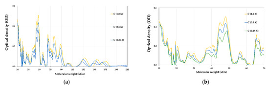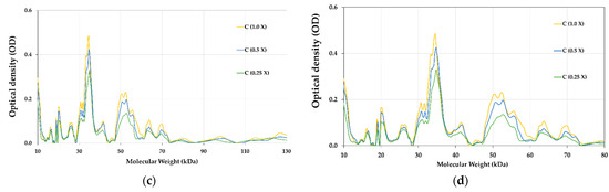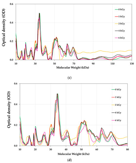 The protein profile of pistachios irradiated at e-beam doses of 0, 1, 2, 4, and 6 kGy are shown in Figure 6 and Figure 7. Figure 8 illustrates the densitometric analysis of control samples at 0.1 X, 0.5 X, and 0.25 X concentrations under Native-PAGE (a,b) and SDS-PAGE conditions (c,d). Figure 6a,b displays the protein profile of irradiated pistachios in native-PAGE and SDS-PAGE conditions, respectively. In Native-PAGE conditions, proteins maintain their original structure and do not undergo denaturation. With this method, the proteins were separated based on their size and electrical charge. The molecular weight of proteins in the Native-PAGE condition ranged from 7 to 310 kDa. In the SDS-PSGE condition, proteins were denatured in the presence of sodium dodecyl sulfate and separated based on their molecular weight. The molecular weight of proteins in the presence of sodium dodecyl sulfate was 0.862 to 297 kDa. Based on the results, the protein profile of the irradiated pistachios changed at a dose of 2 kGy (Figure 6a,b). The results of densitometry in both native-PAGE and SDS-PSGE conditions revealed that the intensity of protein bands with a molecular weight of 11 to 17 kDa increased at a dose of 2 kGy, while at this radiation dose, the intensity of protein bands with a molecular weight of 20 kDa and above was remarkably reduced (Figure 7a–d). Prior results of protein solubility (TSP) indicated that the solubility of proteins increased at a dose of 2 kGy; this elevation can be due to the stimulation of the activity of protease enzymes at this irradiation dose and the breaking of proteins with a high molecular weight due to increased amounts of protein units with low molecular weights. Other irradiation doses raised the protein band intensity compared to that of the control.