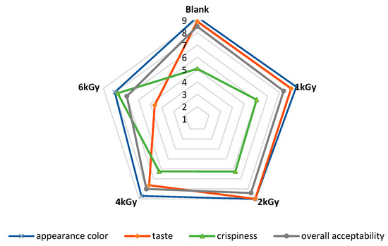Figure 9 represents the scores of the sensory evaluation of un-irradiated and e-beam-irradiated pistachio nuts. According to the results, the panelists did not observe any alteration in the appearance of the treated pistachio nuts at doses ≤ 2 kGy. Still, the pistachios irradiated at doses ≥ 4 kGy received a lower score than the control did due to the darkening of the samples (p < 0.05). These results align with the color measurement, showing that the pistachio nuts’ color darkened after e-beam irradiation at doses up to 6 kGy. The taste of irradiated pistachios at doses ≤ 2 kGy received higher scores than the control did. On the other hand, samples irradiated at higher doses of e-beam (≥4 kGy) received lower scores than the control did. The texture of the samples affected by the e-beam became significantly more fragile than that of the control. Irradiation at a dose of 6 kGy significantly increased the texture fragility of the pistachios. E-beam treatment up to 4 kGy did not affect the overall acceptability of pistachio samples, while higher doses of irradiation (6 kGy) decreased the overall acceptability by lessening the quality features of the pistachio nut samples.