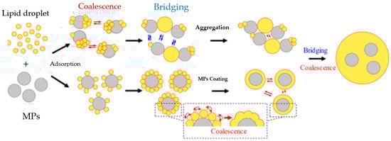 Five different types of MPs (80 mg/L in the small intestines), including PS, PET, PE, PVC, and PLGA, were reported to significantly reduce lipid digestion in the in vitro gastrointestinal system (Table 3). MPs from PS showed the greatest effect, with lipid digestion decreasing with an increased PS concentration, while the MPs’ size showed no effect. This study demonstrated the need to separately assess the effect of NMPs on nutrient digestion and absorption for each polymer. The study also reported significant interactions of MPs with lipid droplets and lipids []. In addition, PS, PE, and PET MPs showed a stronger interaction and aggregation with lipid droplets. Using both experimental and molecular dynamics simulation approaches, two different mechanisms were suggested for the polystyrene MPs-induced lipid digestion inhibition. The first mechanism postulated that the polystyrene MPs decreased the bioavailability of lipid droplets by forming large lipid–MPs heteroaggregrates due to the hydrophobic nature of the MPs (Figure 2). The second mechanism suggested that the MPs adsorbed lipase and reduced its activity by altering its secondary structure []. Their findings revealed the potential risk of MPs to nutrient digestion, absorption, and human health.