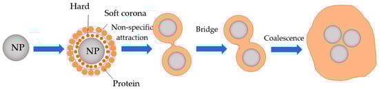The adsorption of proteins on MPs, especially on smaller particles, has been reported in the literature [,,,]. For instance, de Guzman et al. [] recently observed that cows’ milk proteins (caseins) and their larger fragments preferentially bind to the hard corona of PS–MPs during the gastric digestion of milk, leading to the prolonged survival of larger peptides (particularly of αS2-casein) in the simulated gastric fluid. This will be particularly relevant to further studies on the impact of NPs on milk proteins’ digestion and bioavailability. A larger surface area of NPs in comparison to MPs may provide more anchoring points for proteins and digestive enzymes to tightly bind in the hard corona, causing structural changes in proteins and possibly impacting digestive enzymes’ functions. The mechanism for the interaction of proteins with NPs has been proposed [], with the coalescence of NPs and proteins being the final stage of the interaction (Figure 3).