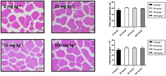 Histological analysis of longissimus thoracis muscle in finishing pigs fed the diets with various levels of dietary CGA. Left: Representative hematoxylin-eosin micrographs of myofiber cross sections of longissimus thoracis (magnification, ×400, bar = 10 μm). Right: Quantitative analysis of fiber diameter and total fiber number in longissimus dorsi. Data are expressed as means ± SEM (n = 5).