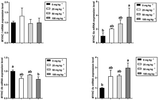 MyHC expression levels in longissimus thoracis muscle of finishing pigs fed the diets with various levels of dietary CGA (n = 5). Within a panel, bars labeled with different superscript letters significantly different at p < 0.05. MyHC I, Myosin heavy chain I; MyHC IIa, Myosin heavy chain IIa; MyHC IIb, Myosin heavy chain IIb; MyHC IIx, Myosin heavy chain IIx.
