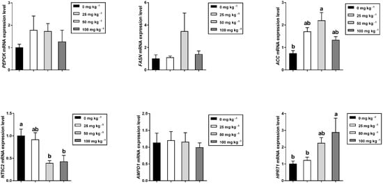 Effects of dietary CGA supplementation on relative mRNA expression of glucose, lipid, and flavor nucleotide metabolism-related genes in longissimus thoracis of finishing pigs (n = 5). Within a panel, bars labeled with different superscript letters significantly different at p < 0.05. PEPCK, Phosphoenolpyruvate carboxykinase; FASN, Fatty acid synthase, ACC1, Acetyl CoA carboxylase 1; NT5C2, 5′-nucleotidase, cytosolic II; AMPD1, Adenosine monophosphate deaminase 1; HPRT1, Hypoxanthine phosphoribosyltransferase 1.