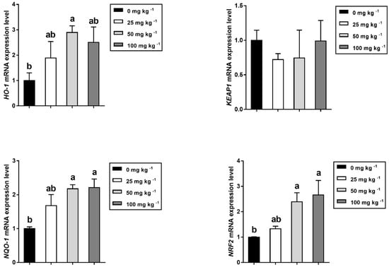 The expression levels of antioxidant-related genes in the longissimus thoracis were displayed in Figure 4. The 50 mg kg−1 dietary CGA supplementation markedly increased the expression of HO-1, NQO-1, and NRF2 compared to the control group (p < 0.05), but had no effects on those for KEAP1 in the longissimus dorsi. When the CGA supplementation dose elevated to 100 mg kg−1, NQO-1 and NRF2 mRNA expression levels were also increased (p < 0.05).