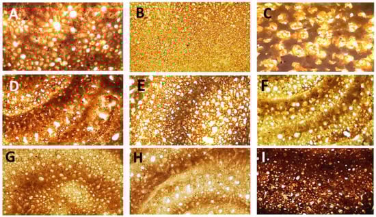 Image of the sections (55 × 30 mm) of Somali and Yemeni breads, viewed over a white light transilluminator to enhance the visibility of the pores. (A,D–I) = samples of Somali laxoox bread; (B,C) = samples of Yemeni lahoh bread.