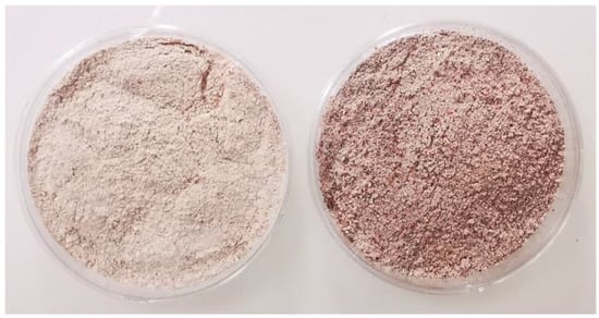 (Left): Flour sample F, used in the production of laxoox Somali bread, was constituted by white and red sorghum, barley, and wheat grains milled together, mixed with refined wheat flour. (Right): Flour sample A, used in the production of laxoox Somali bread was constituted by red sorghum without the addition of refined wheat flour.