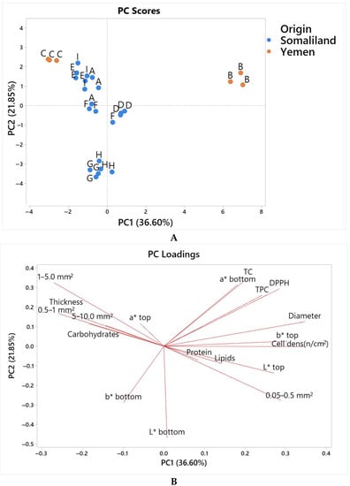 (A) Scatter plot for the first two principal components, PC1 and PC2, obtained for the entire dataset of physical–chemical and nutritional characteristics of Somali and Yemeni breads. A, D, E, F, G, H, and I = samples of Somali laxoox bread; B and C = samples of Yemeni lahoh bread. (B) Variable loading plot for the first two principal components, PC1 and PC2, obtained for the same dataset. L*, a*, b* = color coordinates; DPPH = 2,2-diphenyl-1-picrylhydrazyl radical scavenging test; TC = total carotenoids; TPC = total phenolic compounds.